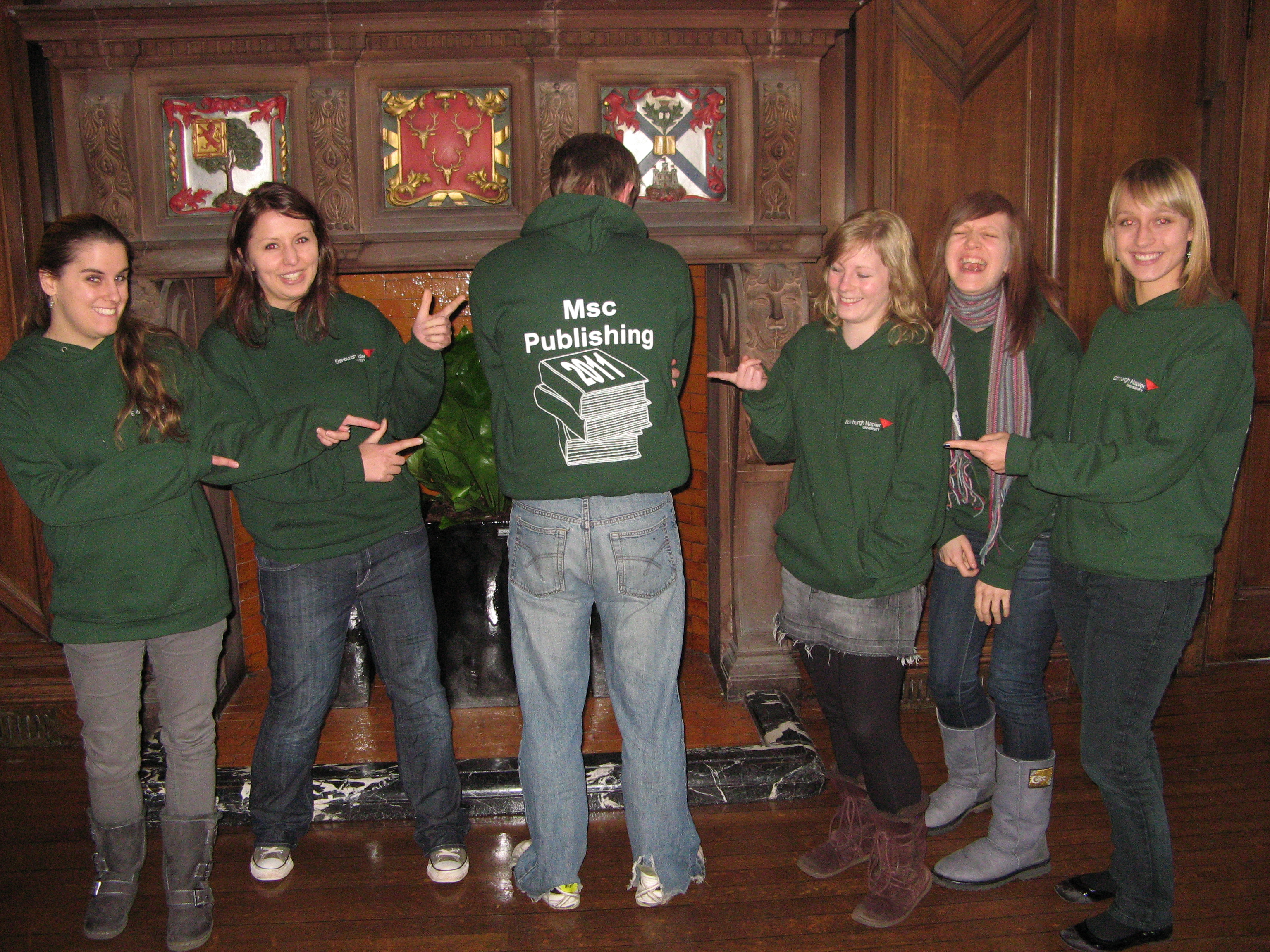 Postgraduate Publishing students model their brand new – and ultra swish – hoodies! The idea was masterminded by Sophie (far right) and last week these future collector’s items were delivered to her eager classmates.
