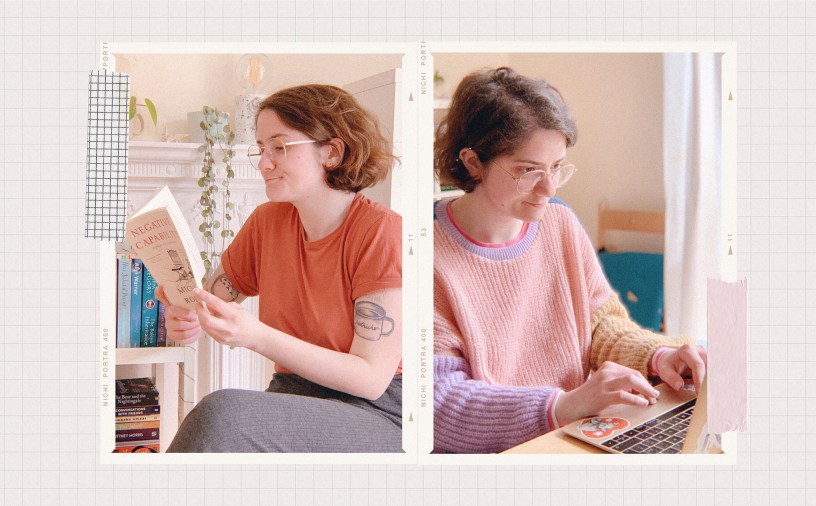[Image description: There are two pictures of Romie. The picture on the left is her reading Negative Capability, by Michèle Roberts, published by Sandstone Press. She’s reading this book for review. She’s wearing a copper t-shirt and grey trousers. The picture on the right is her reading submissions on her laptop. She’s wearing a patchwork jumper with purple, beige and pink on it.]