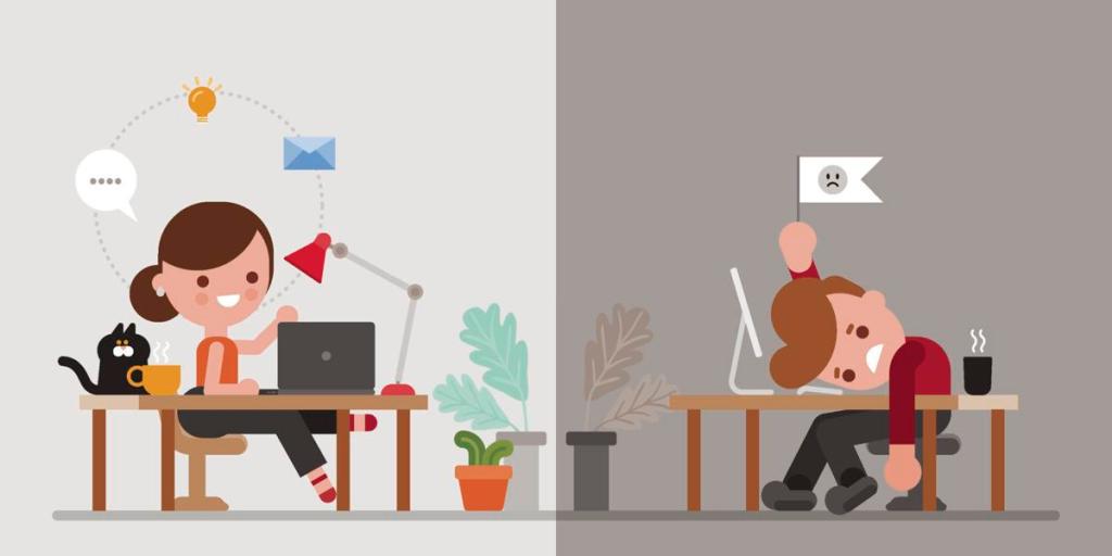 (Image description: A cartoon display of two people at a desk working. A man is pictured on the right hand side of the image. He is holding up a flag with a sad face on it and he man looks tired and fed up, with a hot beverage beside him, possible coffee. He also has a dead-ish looking plant on the floor. On the left hand side is pictured a woman, she is smiling and has a bubble of ideas coming from her head. The woman has a cat beside her and two green plants.)