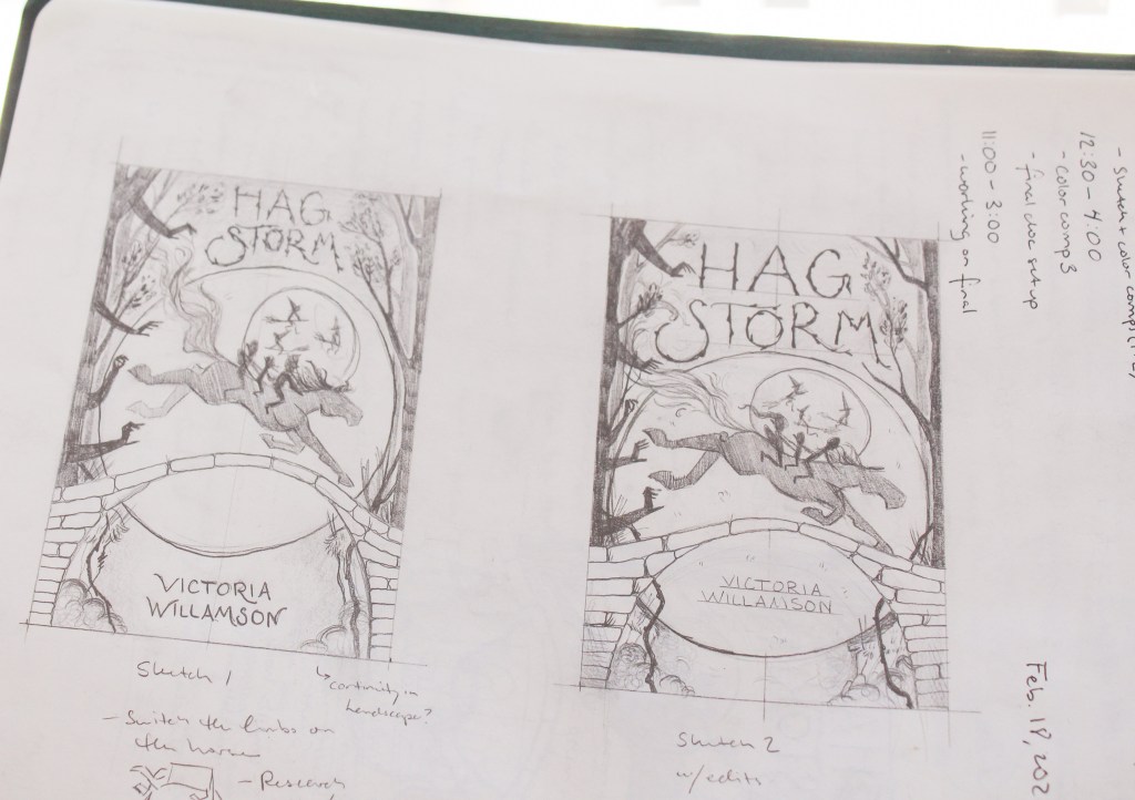 But I manage and I draw my sketch boxes once we’ve settled on a design. I do about three final sketches, getting feedback and indefinitely making as much room for the title as I can. Once we settle on the design and composition, we move to color comps.