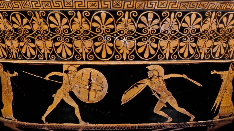Image 1/ Cover Photo: Achilles fights the Ethiopian King Memnon [Achilles Versus the Ethiopian King Memnon] from a red-figured volute-krater attributed to the Berlin Painter. Greece, about 500-480 BC. © The Trustees of the British Museum. Taken from www.theiliad.com/About